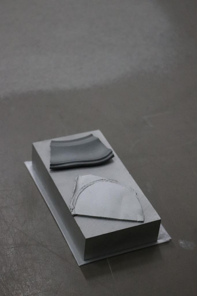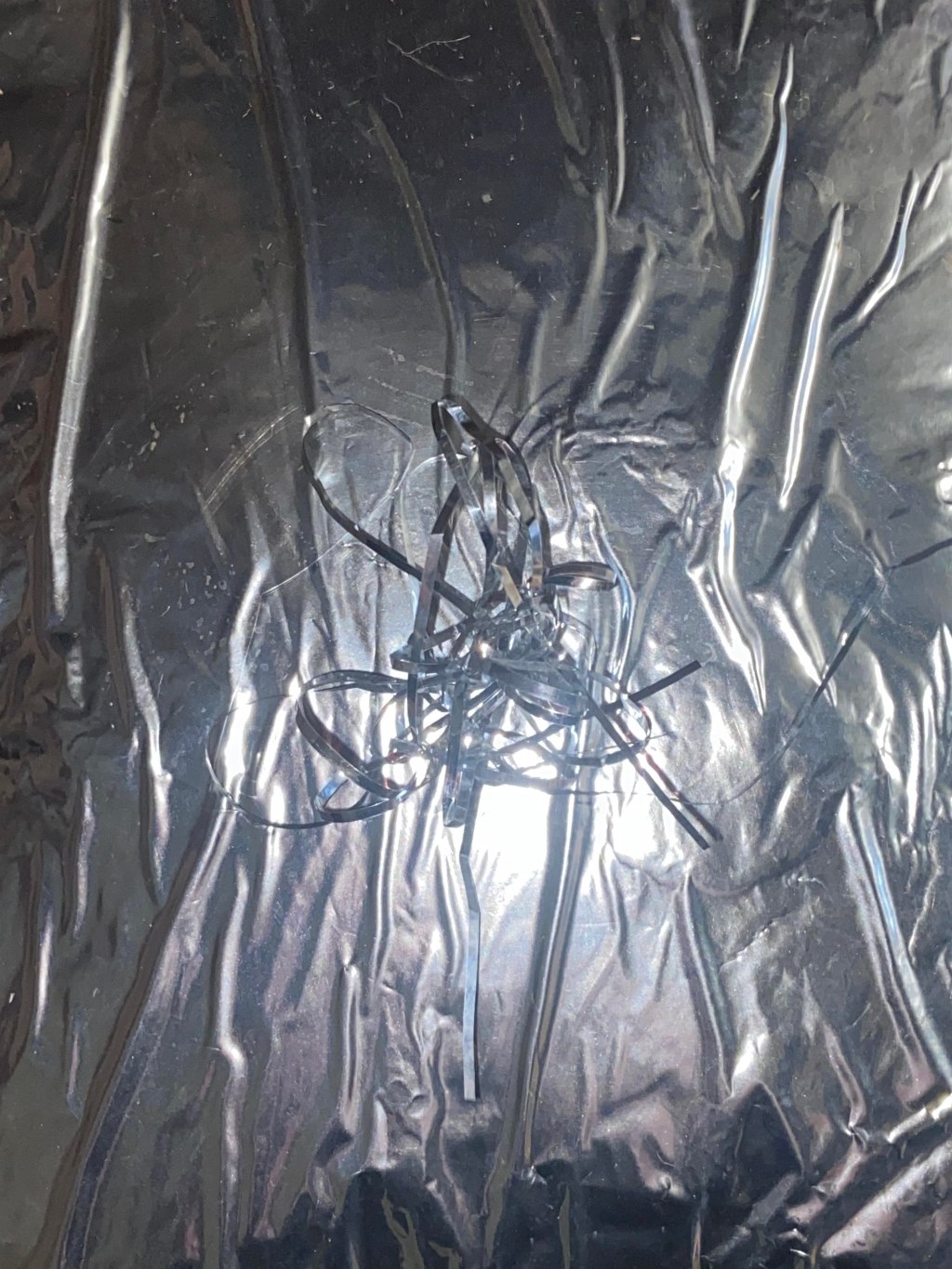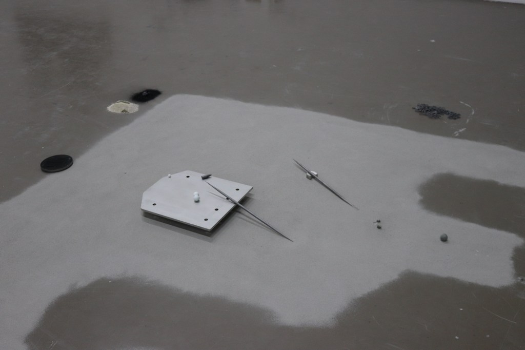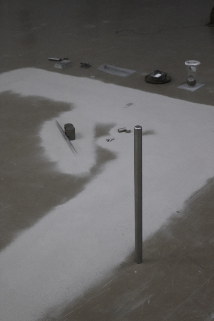 Barre en Inox, étendue de cendres (bois et papier), verre (feuilleté et recyclé), laiton, plastique,œuf de marbre, cuivre, caoutchouc, verre pilé, clou en acier.