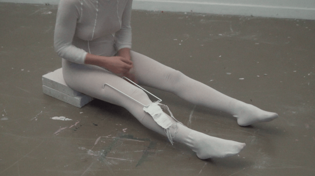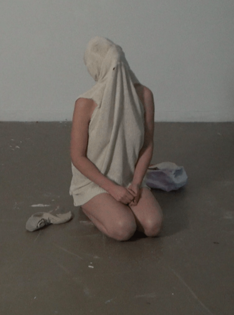 caoutchouc peint, acrylique, body enélasthane, couverture en coton et crêpe de soie, cagoule intégrale en laine et coton, chaussette en coton, caoutchouc et peinture acrylique.